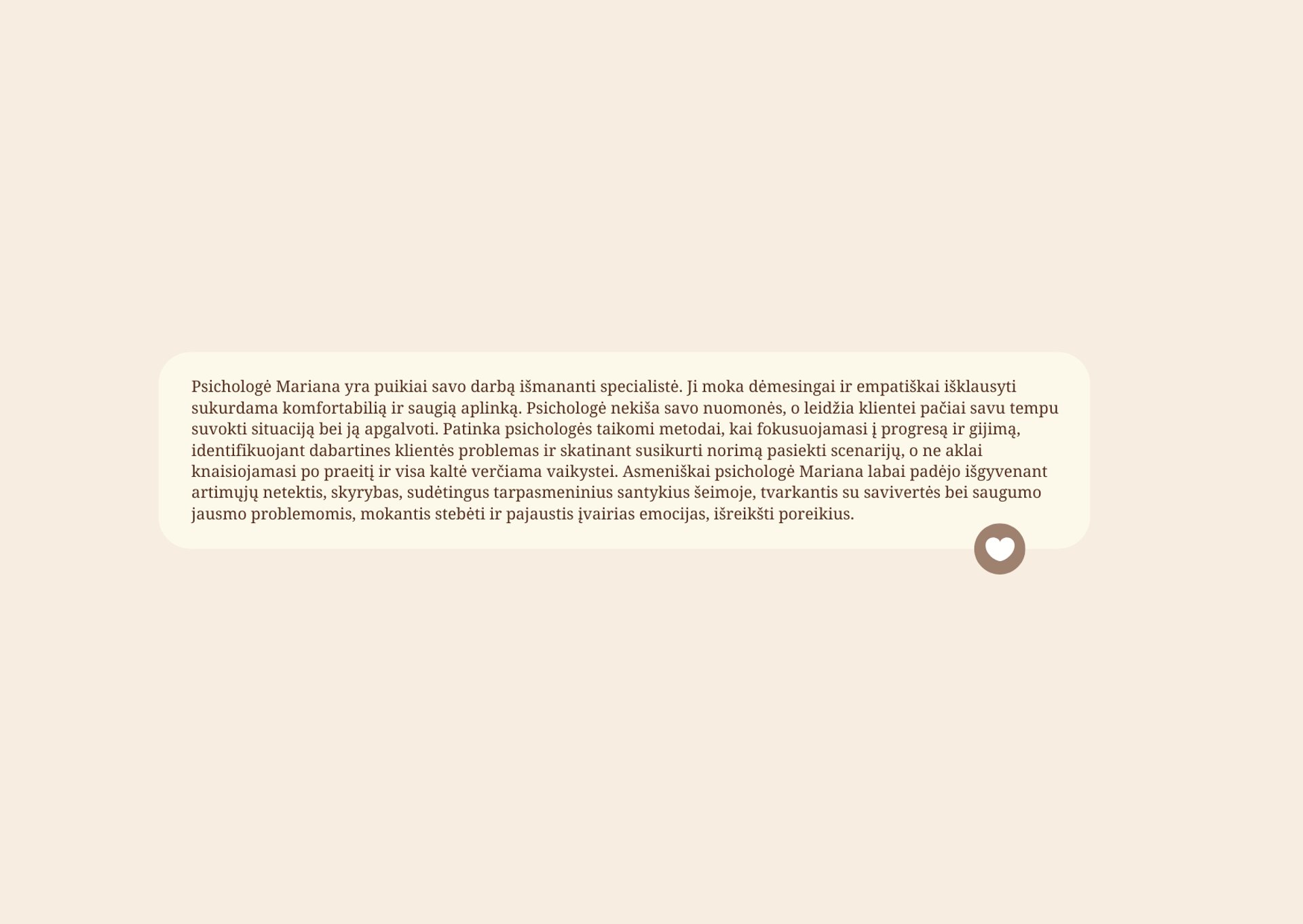 Esu Mariana, psichologė - psichoterapeutė. Mano misija - padėti tau pradėti gyventi kitaip. Konsultuoju nuotoliniu būdu ir gyvai Vilniuje, remdamasi Kognityvinės elgesio terapijos ir Schemų terapijos principais ir metodais.